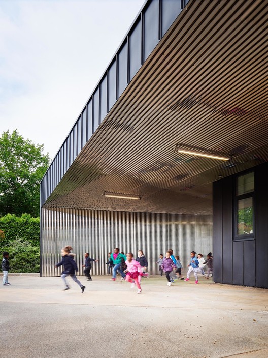 From the architect. The design for the extension of the Alliés de Chavannes nursery school draws on its context within the landscape and its integration within the site. The three new volumes that house the extension connect to the longitudinal circulation of the existing building in such a way as to allow them to be perceived as separate pavilions.