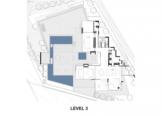 Working with a relatively steep site and the fact that the Southern boundary is shared with a National Park, the design took on a sensitive approach. The secondary spaces were positioned at the lower levels with care taken to limit excavation. From the road these levels are concealed by a large North facing landscape wall – its customised angular design achieves a natural result. Strategically positioned penetrations within the landscape wall permit natural light and ventilation to the rooms beyond but glazing is set back and thereby concealed.