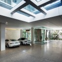 “On arrival at a mid-level one is lured through the main garage with its double volume and graffiti walls towards the shaft of light and splash of landscaping emanating from the glazed Entrance Area beyond. Sculptural timber clad stairs wrap themselves around a centrally positioned lift and take one to the upper levels of the house,” says Philip Olmesdahl, SAOTA director and project team member. The building is limited to only two storeys above the ridge. The main living areas, pool terrace and garden are below with the family bedrooms strategically positioned at the uppermost level for privacy.