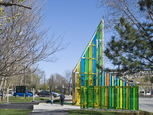 Vertical stripes of transparent coloured glass accentuate the structure’s height and form. Because of its south orientation, a dramatic wash of coloured light is projected through its walls and on into the site on sunny days. The play of transparencies and reflections further accentuates a complex and palpable experience – a visual happening that if only momentarily, returns us to a child’s capacity for wonder.