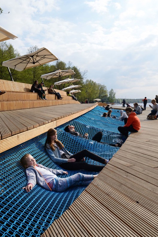 The main purpose in selecting materials was to emphasize the natural character of an area by using mainly natural materials. Part of constructions were covered by specially shaped land and planted with grass. To finish off the promenade area, benches and railings we used softwood. Other hardened areas such as bike parkings, places under gym equipment were made from completely water permeable surfaces based on mineral aggregates and EPDM granules. Sections of Promenade which are over the lake are constructed with steel beams founded on reinforced concrete piles hammered into the lake bottom. Terrain is illuminated only by energy-saving LED lights.