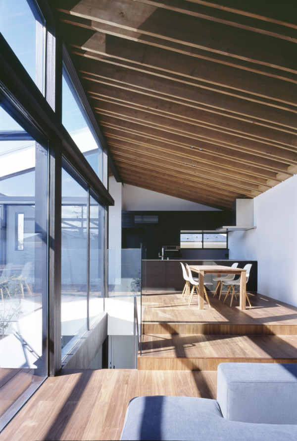 Built-in furniture is provided next to the living space for storing books and records, while large sliding doors are installed to unify this area with the exterior living space. The dining and kitchen space is situated on a raised floor, allowing gradual separation from the living area, while also providing a theatrical aspect to the space.