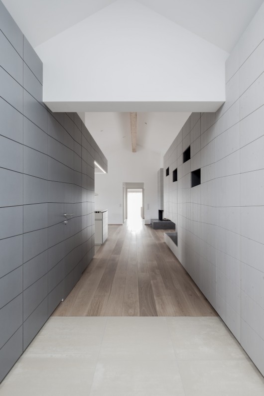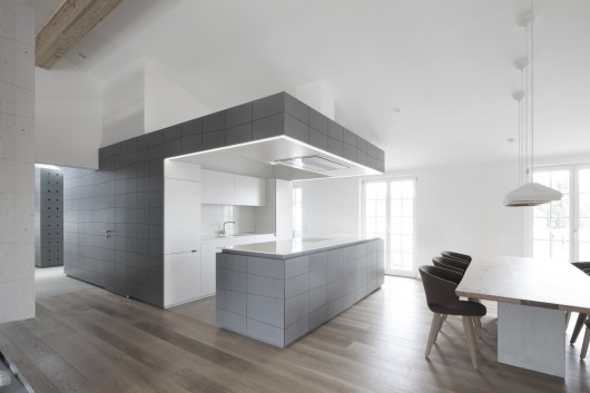 The design concept is inspired by structures, textures, and the dynamics of roofscapes. It also pays tribute to a specific feature of Austrian post-war architecture by incorporating milled eternit façade panels as furniture fronts far beyond the central kitchen area.