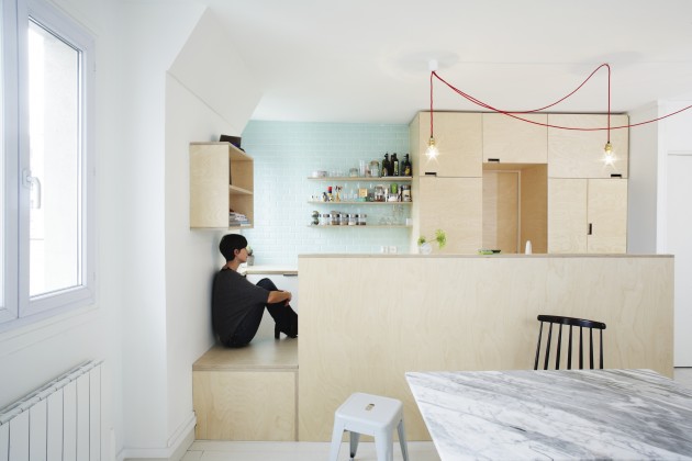 A winning combination in a remodeled Right Bank apartment: birch plywood, white paint, and a hint of mint.