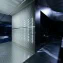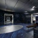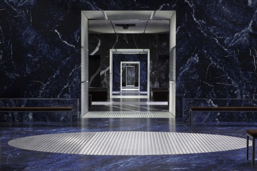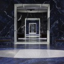 “Blue and black (false) marble cover the floors and walls transforming each space into a tridimensional excavation. In this disorientating landscape aluminum geometric inserts in the ground mark the sequence of spaces.”