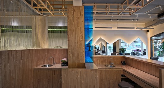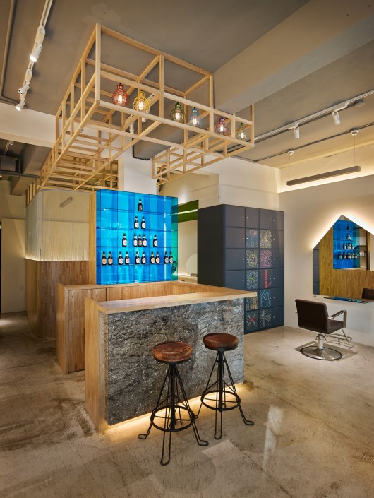 The main idea of spacing is locating a bar at the central, then connecting with other divisions. We manipulate different shapes of mirrors and various kinds of lighting to create changeable atmosphere of each room. The huge mountain-shaped mirrors and walls in hair cutting area overlap their reflections by lighting. The moveable egg-shaped mirrors and the lawn on the ceiling in hair coloring area interest the space by reversing routine. The curve compartment with lighting band isolate VIP Room 1 from public to noble. The hair salon is only 98.0 sqm, but we create five featured spaces with lighting to make it merge into one specific studio.