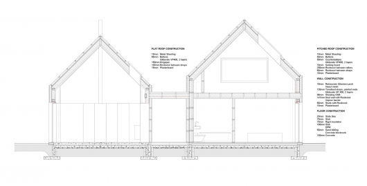 The roofs are constructed with 10mm aluminium roof sheeting, finished with black Plannja Hard Coat surface coating and laid on battens. The 18mm Siberian larch rainscreen cladding to the walls has been stained black with an OSMO water-based product.