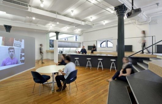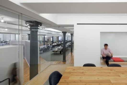 The space was particularly challenging because the windows started at 6′ above the floor. New platforms were added along the perimeter containing war rooms for the various organizations and movements purpose has launched.