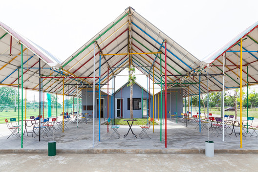Located next to Duc Tho stadium closed for nearly ten years due to damages, Re-ainbow is a multifunctional construction project for community built of both “static” and “dynamic” categories. “Static” categories include health station, public restrooms and ancillary areas. Around the central garden is the “dynamic” categories featuring classroom, art performance theater, meeting place, sports fitness center, refreshment tent, which possess multiple functions with the use of movable partition walls and enclosing walls according to their respective needs. Outside this works are areas for physical training such as volleyball, badminton, long jump, and other outdoor activities as well.