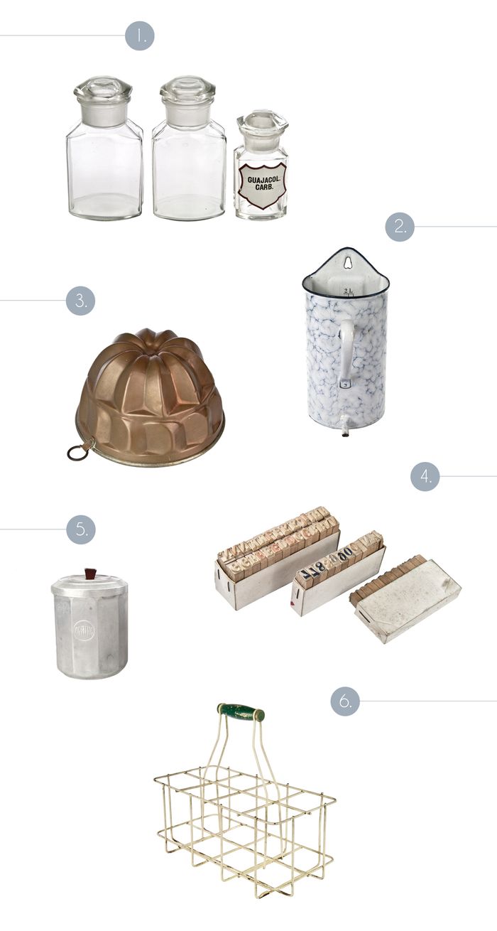 { 1. Vintage apothecary bottles , 2. Vintage enamelware , 3. Vintage copper pudding mold , 4. Vintage rubber stamps , 5. Vintage aluminum kitchen canister set , 6. Vintage wire bottle carrier }