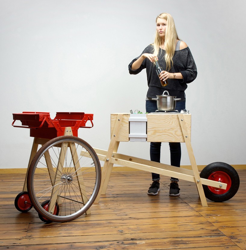 the workshop consists of two different modules: a field kitchen featuring a gas cooker and storage space for food, water, and cooking supplies, and the second one is a transportable box for tools and spare parts.