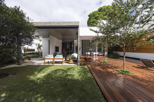 The division of the volumes on the main floor was initially drawn by the presence of a large tree in the ground, which created a division into two blocks, one social and the other private. By contrast, two open spaces were created, an entrance garden in an interior leisure area with a pool and a large deck.