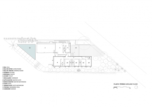 Despite the mandatory use of a sloping roof and ceramic tiles, the house seems to have a flat roof, as from the outside one can only see the wooden eaves and glass. The minimum slope we create is only visible from inside. The triangular pool has its shape determined by the boundaries of the building.
