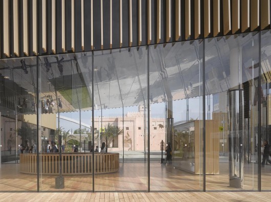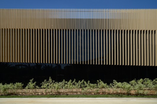 The interiors of the pavilion area are also designed by SPEECH: the mirrored ceiling is echoed by the load-bearing columns trimmed in stainless steel, and the oval shaped reception desk is made of wood, picking up and developing the theme of the rigid rhythm of slats on the side facades of the building.