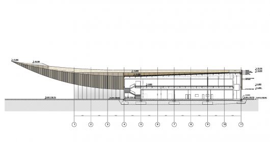 From the architect. Located on the EXPO’s main street Decumano, the Russian pavilion is a 3,260 square meter building. The structure virtually repeats the given plot of land with an elongated and rather narrow parallelepiped configuration, thrusting forward a dynamic cantilever over the main entrance to the pavilion.