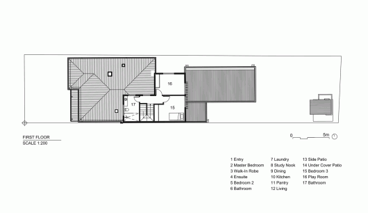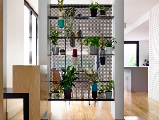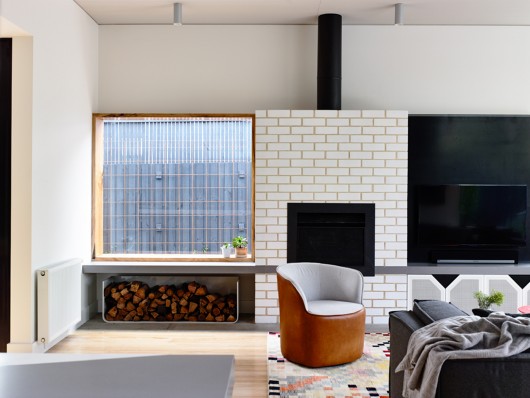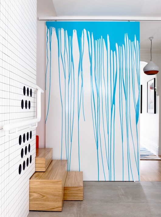 The two areas – original front and new extension – are separated by a perforated black folded screen that acts as not only a visual separation, but also an interesting feature. Cutouts in the screen are designed specifically for colourful Dinosaur Design vases. A mid-grey tile separates and defines the step up from old to new, while three irregular sized box-like timber steps lead to the upstairs, then solid messmate flooring flows through the new extension.