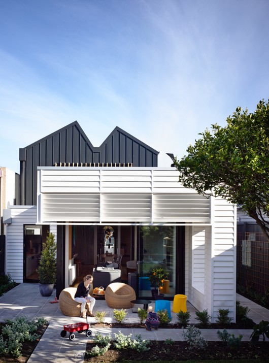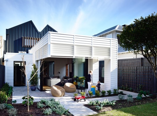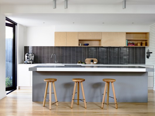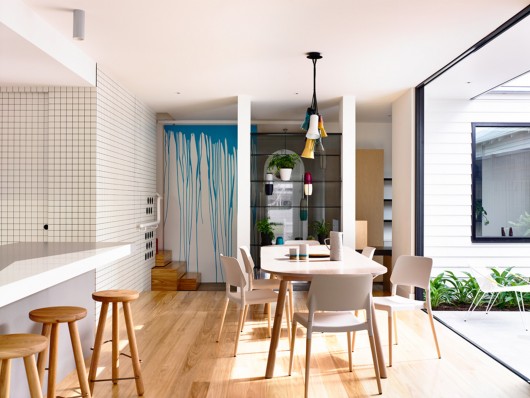 Checkerboard black-and-white wall paneling is a strong graphic detail that not only adds the playful element the client wanted, but also a personal touch. The client owns pubs in Melbourne, so wanted a display solution for his wine and beer. The checkerboard feature is a laminate box that surrounds the pantry and features 14 circular cutouts for wine, which can be accessed only from behind the pantry. The garden was designed by Annabel Drew as a lush green garden with grassed areas and old railway sleepers.
