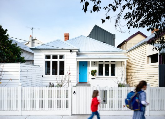 From the architect. The front of the home was retained and a two-storey extension added by Techne Architects. The extension was based on the form of a contemporary shipping container and the interior designed to reflect a simple, utilitarian aesthetic, that plays with materiality, bold graphic shapes in robust finishes injected with strong blocks of colour.