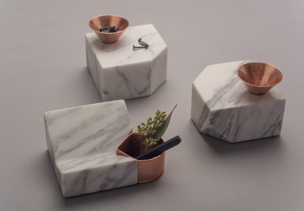 Combining handcrafted marble and hammered copper, Peca’s head designer, Caterina Moretti, created a collection of versatile organizers with a sculptural feel. The copper parts were produced in Santa Clara del Cobre, a place known for their traditional coppersmithing, the pieces were appropriately named Santa Clara.