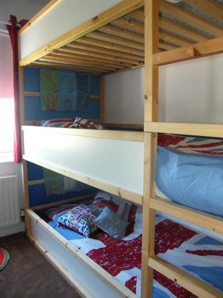Three identical beds placed on one top of the other is the classical design. And you can build such a system yourself. You need the beds, some steel rods and side panels. Obviously, you need to make the frame is secure so don’t even attempt this project if you’re having doubts about your talent as a DIYer.{found on ikeahackers}.