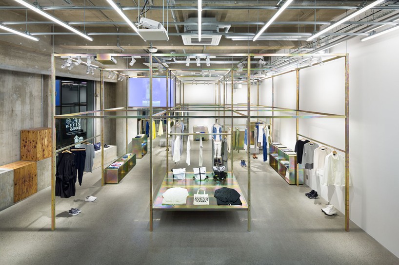 jo nagasaka of schemata architects has recently completed the new retail space for the japanese clothing brand, a chromate treated steel frame is integrated into the interior as a decorative and functional element.