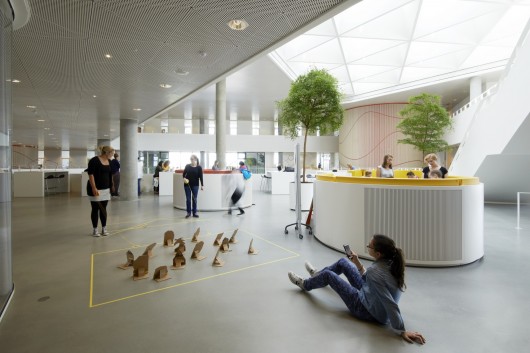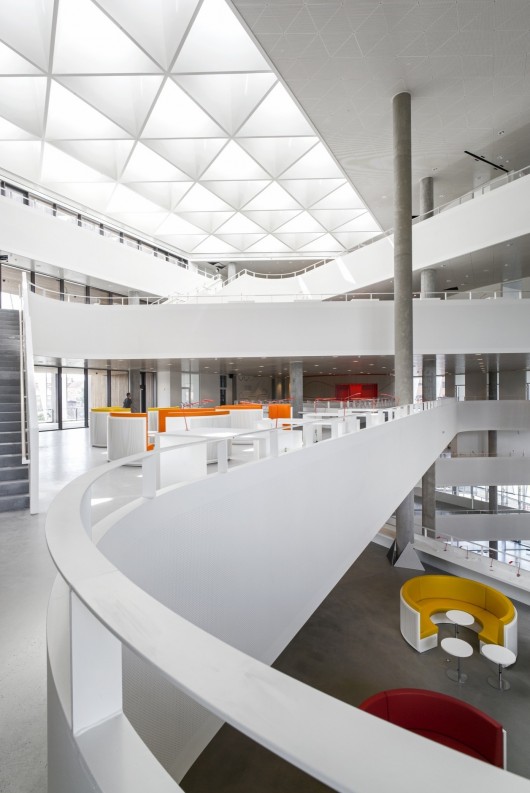 The facade is an integrated part of the building and together, they create a unique and varying expression. Inside in the five floor high atrium, the displaced position of the staircases and access balconies creates a special dynamics where the triangular shape repeats its pattern in a continuous variety of positions up through the different floors. The activities open up towards the town so that the campus plaza and the interior study universe become one interconnected urban space with a green park at the back and a common recreational town plaza at the front.