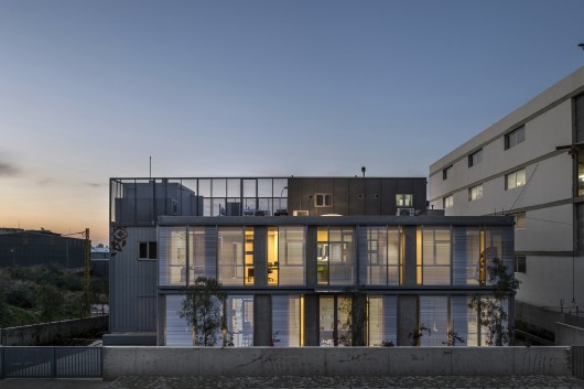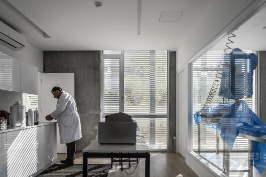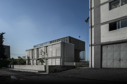 The second structure, which hosts the company’s offices, benefits from wide openings, protected from the sun thanks to sliding aluminum louvers that bring privacy to employees.