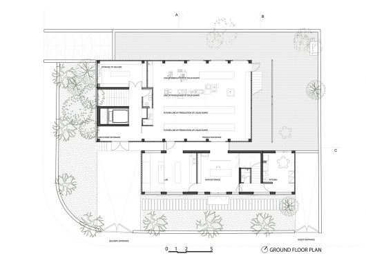 From the architect. The concept behind the main headquarters of this luxury soap brand revolves around the actual soap bar. Inspired by the intricate packaging of the company’s soaps, the structure was first conceived as a box, sliced in half.