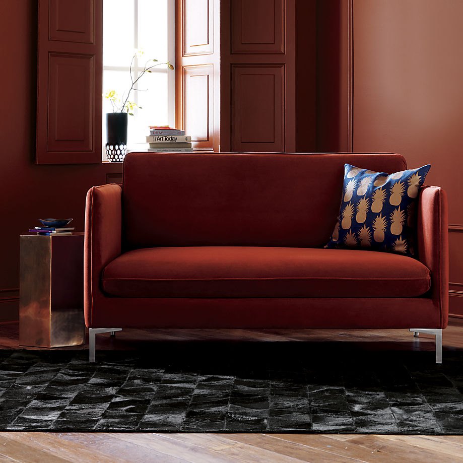 When the sofa is rust, make it pop with a pillow in teal, such as the Linden Peacock Blue Pillow from Crate & Barrel: