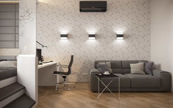 The first studio comes from design Igor Glushan. The simple Saint Petersburg space was designed for a modern technology employee. By keeping the design fairly simple, with a very basic gray and white color palette, the space is easily adapated to many different personalities. Of course, the neutral colors also serve to open up the space, allowing for more light and a brighter feeling overall.