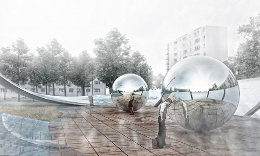 Made of polished concrete, the outer circular structure represents the struggle faced by the Jewish people of whether to hide or present themselves. This experience is mirrored as visitors explore the open space defined by the circle as well as the tighter spaces within the form itself. In the circle’s enclosure, two stainless steel spheres symbolize the dichotomy of humanity’s good and bad sides, representing a balance between these elements. Simultaneously, they represent the two spheres of the Polish people, the Jewish and non-Jewish, all united by their collective identity (the outer circle).