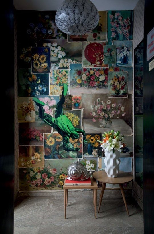 It’s apparent, from the moment you step into the entryway of this São Paulo apartment, that this is a space not quite like any other. The room is papered with a mural made of vintage paintings of flowers, liberated from their frames — and that’s only a hint of what’s within.