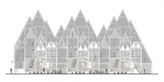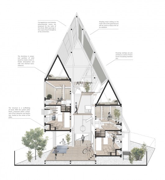 In a practical sense, this notion is manifest in a series of separate volumes unified by shared spaces for circulation and socializing. Private living spaces are stacked and arranged within a timber scaffold and topped with PVC A-frame roofs that allow ventilation and sunlight penetration. Common spaces between dwellings are used as recreational areas, and for utilities such as shared gardens and clotheslines. República Portátil emphasize the “development of relationships between strangers”, and reframe daily activities as acts of social gathering.