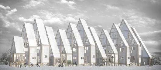 An economy of space pervades the project; at a large scale with the multi-residential structures and at a smaller one in the individual rooms. Furniture is wall-mounted and multifunctional, and sleeping quarters tucked into the attic space of each residential unit.