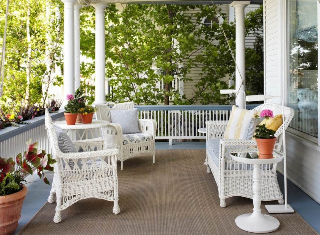 For a particularly fresh and breezy look, use white wicker furniture on a deck or porch with white flooring, walls and columns. This idea is especially good if the space is small. All the white elements help it look and feel bigger.