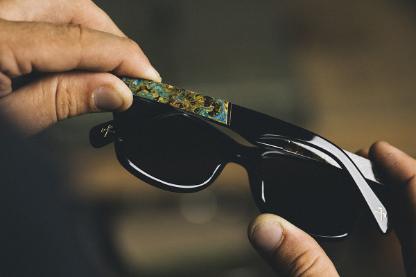 Using an in-house procedure, Shwood ages brass inlays to mimic natural processes. As a result, a whirlpool of blues, golds, and glittering turquoises blend together to create a mesmerizing look. The brass inlays are then fit into wood or acetate versions of their best-selling silhouette, the Canby. All lenses are Japanese polarized lenses and are available here.