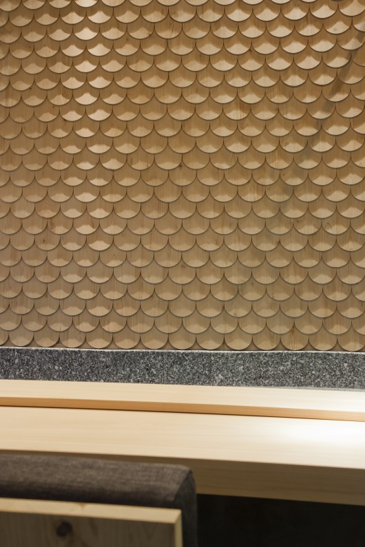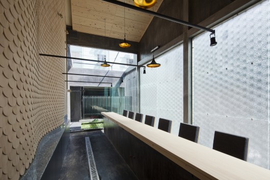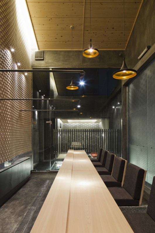 A chef is the center role. Less color to bring out his presence, Expressing fish-scales with cypress-tiles put on the whole wall. The curving wall covers existing columns.