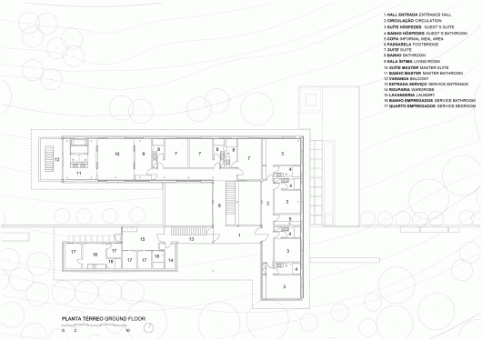 The piloti space formed holds verandas and all of the social area, outlined by sliding glass frames. On the superior level besides the accesses and service areas that are facing the road, are the family’s bedrooms and guest bedrooms overlooking the lake. The leisure area such as the children’s playroom, home cinema, sauna and spa meet within the stone wall, below the entrance level, thus diminishing the visual impact of the constructed house. The pool connects these embedded spaces with the gardens.