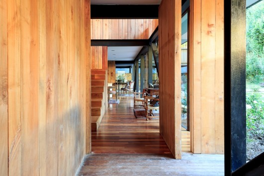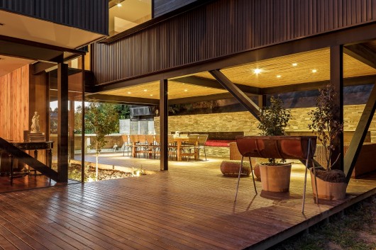 The horizontal fenestration, with long, transparent and continuous planes framed with steel plates like a visor, ratify the horizontal volumes that make up the house, like the parking and covered walkway to the house and the two wings of bedrooms, all trying to break free of the anchorage of the ground, looking for an expression of lightness, which does not touch the hill or the site.