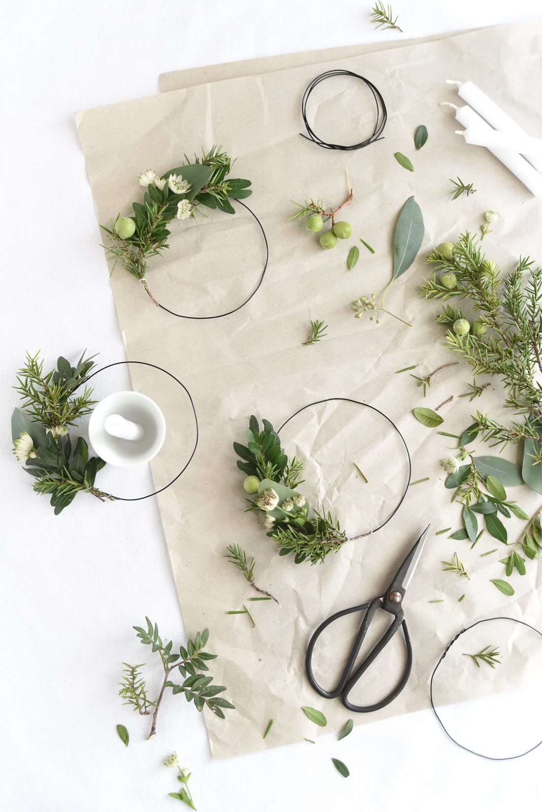In addition I made four fine circles out of black aluminum wire and tied some very small sprigs. It doesn’t have to be a whole wreath to make an impact! Tiny candle arrangements took a seat in the middle of my “half wreaths”. All you need are plain egg cups, Christmas tree candles and wax dots to fix the candles (just never leave candles unattended). You can find a step-by-step DIY showing how to add flowers to a circle in the book Decorate With Flowers (under Coat Hanger Wreath) – you can download the book from Amazon right here.