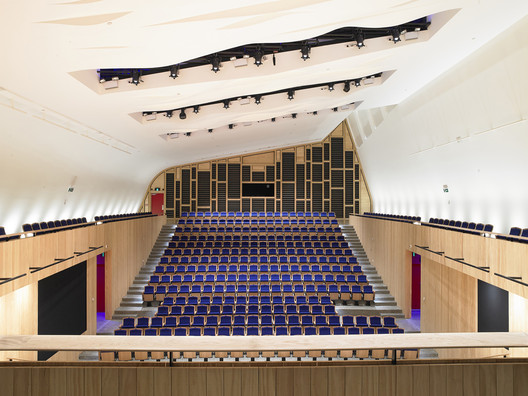 A high window brings in natural light from the south and a low window frames a view to the landscape. A louvered wall in the chamber enables different reverberation for musical and theatrical use, and acoustic sculpted ‘ribbon’ reflective panels are integrated into the ceiling.