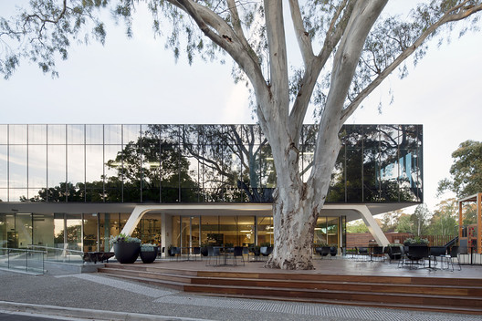 The mass of the upper floor is clad in highly-reflective double-glazing, allowing it to not only perform well in the harsh Australian climate but also cloak itself in the imagery of its natural setting rather than compete with it. The building’s long, smooth and ephemeral form catches and continues the colours and shapes of the surrounding sky and tree canopies, shifting and changing as time passes and weather turns – a simple homage to the beautiful yet transitory patterns of life.
