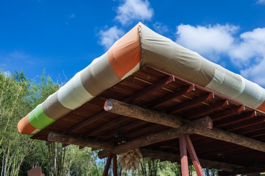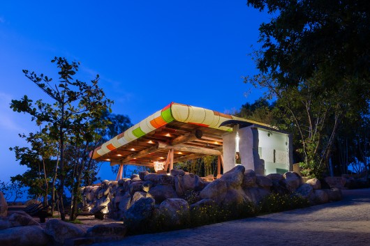 A big lantern, with a light metal frame covered by colorful canvas, has played as not only a main light source for the whole restaurant but also a roof that protect guests from rain and sun. Moreover, this colorful light becomes the landmark of the resort when being observed from the city, just over the river.