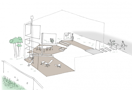 Then, we produced a plan giving a sense of spatial expanse by lowering the floor level gradually from the entrance making use of 1.4m-difference in height within the site. Each difference in level of the floors was set such to be able to sit, and to use it as a chair. This arrangement helped to connect spaces without any divisions of said space that might be created by the differences in the floor levels.