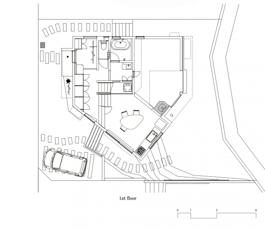 Firstly, arrangement of a pentagonal building on the site allowed us to gently divide the yard into eastern and western partitions, and created changes in the scenery of the yard as seen from the inside. In addition, we created a continuous space with a sense of depth but whose entirety cannot be seen despite it being one room.