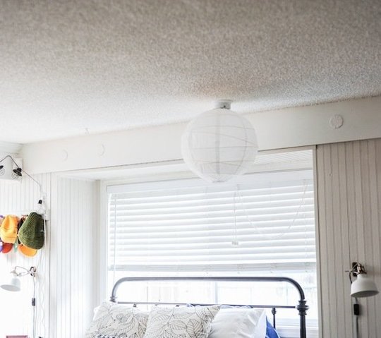 Our home is old enough that it has outdated popcorn ceilings, but we don’t have enough time or money to have them all removed. So to make our room more intimate and relaxing as well as mask the holey (yes there are a couple small holes in it) ceiling, I decided to construct two bedroom canopies.