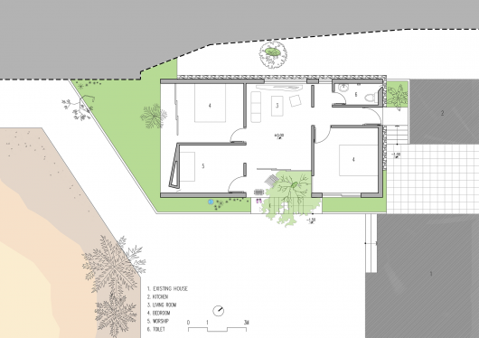 An open-space is towards the existing garden. The appearance of “The Shelter” is a symbiotic unity with the old house.
