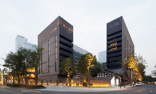 The city-facing brick facades of the hotel and apartment segments were inspired by the local production of brocade, with façade panels formed of brick and black solid reconstituted stone lintel elements. The three-dimensional woven façade combines modern design with the traditional Chengdu architectural elements of timber, brick and step stones.