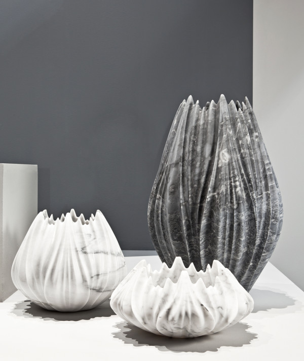 The Tau Vases appear organic and delicate in nature, almost flower petal-like, but their marble material defies expectations with what looks like pleated grooves. The vases are available in five sizes in various marbles.