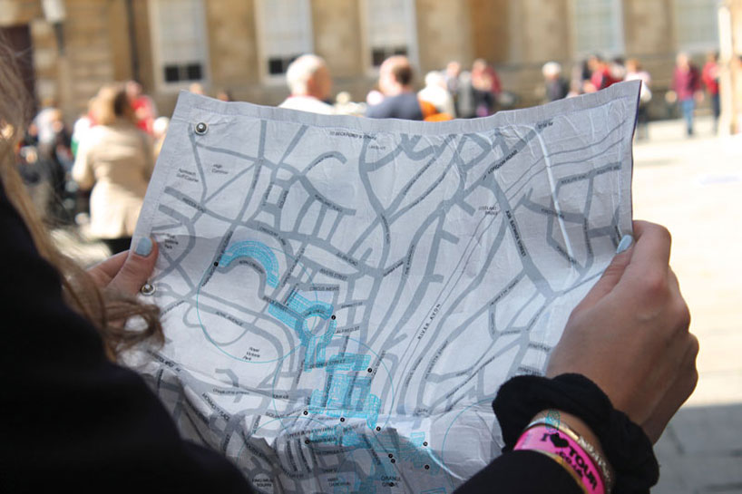 a hand held, color coded, temperature controlled map, uses thermochromic inks that are activated at different temperatures, revealing layers of hand illustrated buildings and attractions.